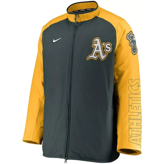 Maintain your status as the ultimate Oakland Athletics fan through the winter months with this Authentic Collection Dugout full-zip jacket from Nike. The elastic cords at the waist and cuffs keep warmth inside so that you can maintain your comfort, and the stellar Oakland Athletics-inspired design on the exterior is just what you need to proclaim your allegiance to your squad.