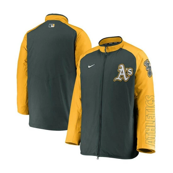 Maintain your status as the ultimate Oakland Athletics fan through the winter months with this Authentic Collection Dugout full-zip jacket from Nike. The elastic cords at the waist and cuffs keep warmth inside so that you can maintain your comfort, and the stellar Oakland Athletics-inspired design on the exterior is just what you need to proclaim your allegiance to your squad.