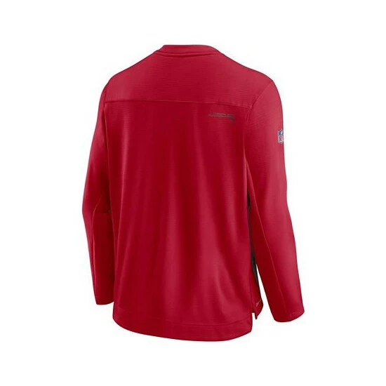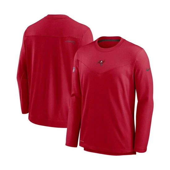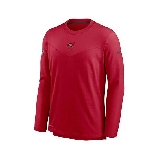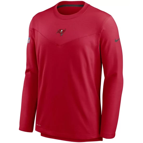 Grab the same game day gear issued to the Tampa Bay Buccaneers with this Sideline pullover sweatshirt from Nike. It features a classic crew neck design and an eye-catching chevron chest panel, highlighted by a raised team logo. Perfect as a lightweight outer layer, this Tampa Bay Buccaneers top is built with moisture-wicking Dri-FIT technology to help keep you comfortable.