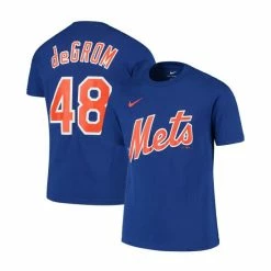 Your youngster is looking for an awesome tee to wear whenever they go to the ballpark. You can help them do just that by getting this Jacob deGrom New York Mets Player Name and Number T-shirt from Nike. With stunning New York Mets and Jacob deGrom graphics on the front and back, your kiddo will be able to showcase their fierce devotion to the team.